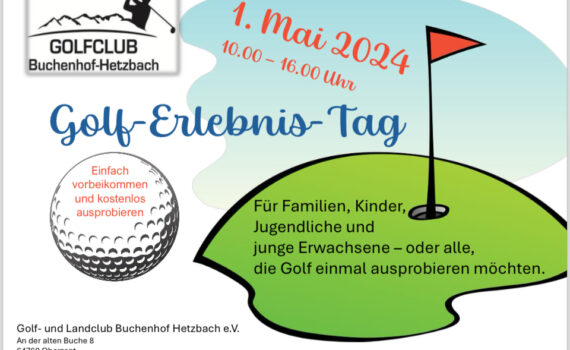 Am 1.5.2023 bieten wir neugierigen und interessierten Gästen die kostenlose Möglichkeit an, den Golfsport auf dem Golfplatz Buchenhof-Hetzbach hautnah kennenzulernen. Für Jung und Alt startet ab 10 Uhr der Golf Erlebnistag. Für weitere Infos bitte auf das Bild klicken.